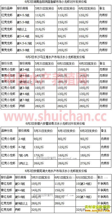 2017年小龙虾市场价格多少钱一斤?水产批发市场最新小龙虾价格多少钱?2017年6月2日全国部分水产市场小龙虾价格行情(单位:元/公斤):端午节小长假过了三天了,市场上小龙虾的交易量和交易价格都出现了下滑,不过今天周五,市场有望恢复,加上温度升高,根据湖北湖南安徽等地收购商反馈上来的消息,这两天小龙虾捕捞情况不理想,货源有些吃紧,昨天早上行情还在下滑,到了下午就止跌回稳,到了今天报价就开始回升。江浙沪“包邮区”小龙虾行情有好有坏,上海南京价格稳中略涨,苏南地区行情略微疲软,无锡地区中等规格青壳小龙虾行情不错,大规格青壳小龙虾不太理想。五月份以后,市场上小龙虾的交易出现一个特点,就是上市量整体很大,供应商的竞争比较强,报同样的价格发货,实际上打货的规格都要硬一些。以下是6月2日中国水产养殖网小龙虾直通车湖北潜江武汉洪湖汉川、湖南长沙岳阳、安徽六安芜湖合肥、江苏南京常州兴化苏州、浙江宁波、上海北京东莞深圳等地小龙虾价格播报。